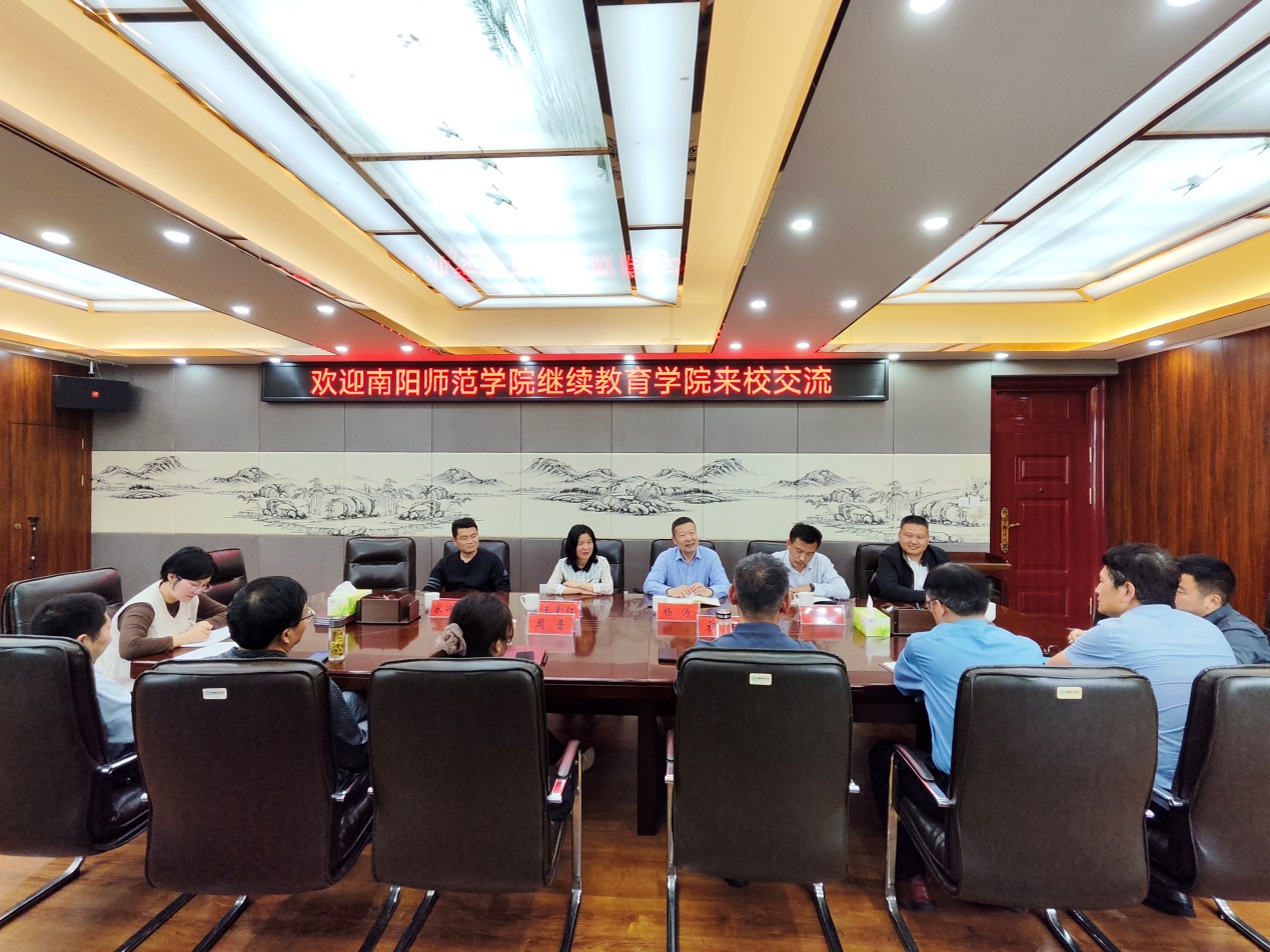 祝军对南阳师院学院同行的到来表示热烈欢迎,介绍了我校继续教育办学历史、发展现状。杨涛对我院的热情接待表示感谢,高度评价我校2023年高等学历继续教育教学评估工作。双方就高等学历继续教育、校外教学点管理、非学历继续教育工作等进行了深入交流。